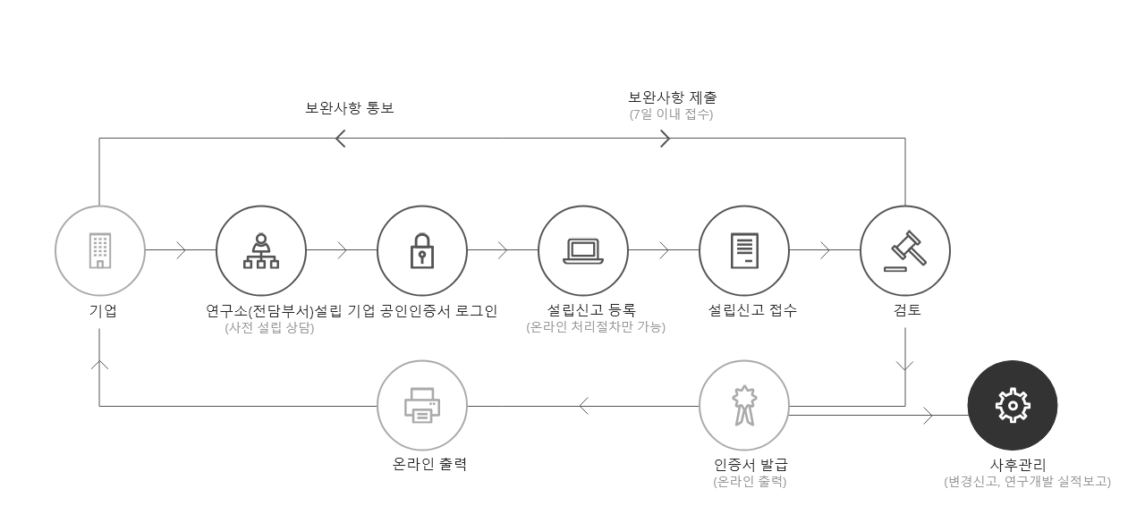 사업자등록증 사본 회사조직도 및 연구소 조직도 각 1부 도면(층 전체도면 및 내부도면) 전용출입구 현관사진 및 내부사진 4대 사회보험 사업장 가입자 명부 등등 |